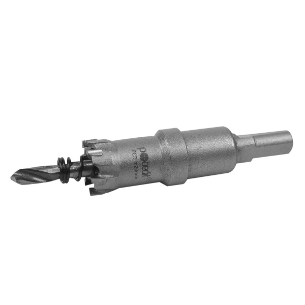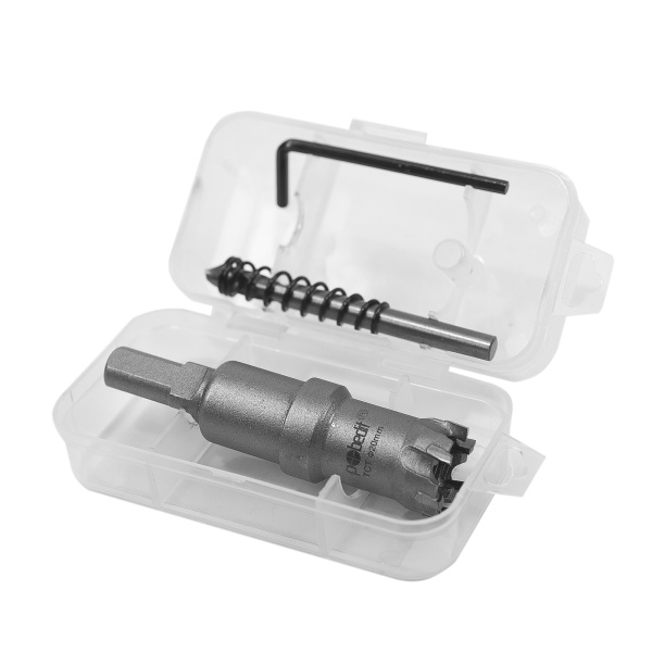 Коронка используется для сверлильных работ по черным, цветным металлам, пластику и другим материалам. Глубина сверления до 28 мм. Режущие пластины изготовлены из сплава карбид-вольфрама, корпус из высокоуглеродистой стали. Режущие пластины твердостью 91-92 HRC. Трёхгранный хвостовик. Специальная пружина на центрирующем сверле, не допускает застревания шлама.