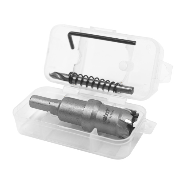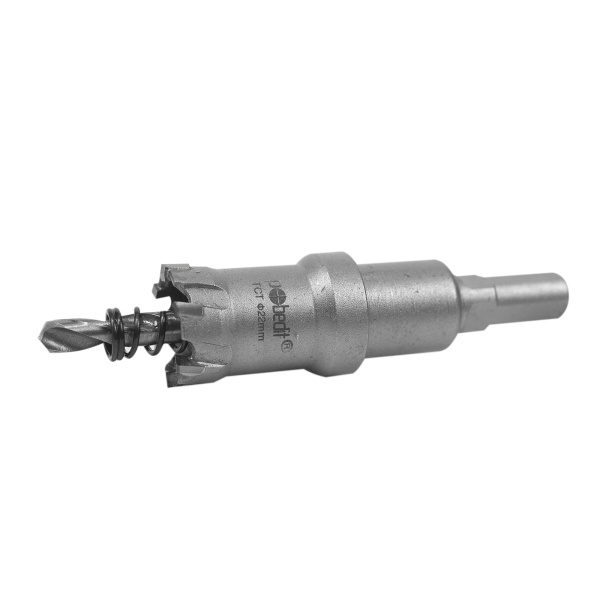 Коронка используется для сверлильных работ по черным, цветным металлам, пластику и другим материалам. Глубина сверления до 28 мм. Режущие пластины изготовлены из сплава карбид-вольфрама, корпус из высокоуглеродистой стали. Режущие пластины твердостью 91-92 HRC. Трёхгранный хвостовик. Специальная пружина на центрирующем сверле, не допускает застревания шлама.