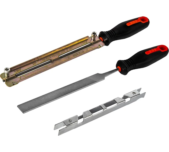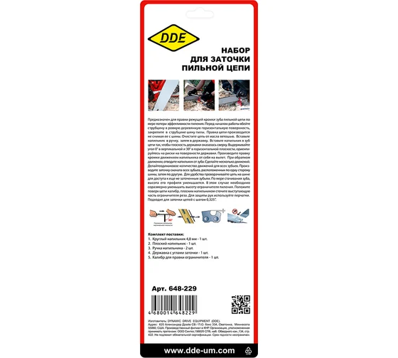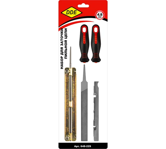 Заточной набор включает в себя все необходимое для профессиональной заточки цепи бензопилы, не снимая ее с самой пилы. Данный набор подходит для заточки цепи с шагом 0.325". Заточной набор включает в себя плоский напильник для стачивания ограничителя глубины, круглый напильник + 2 ручки, державка с линиями, которые показывают углы заточки, шаблон, который служит для правки и соблюдения параметров.