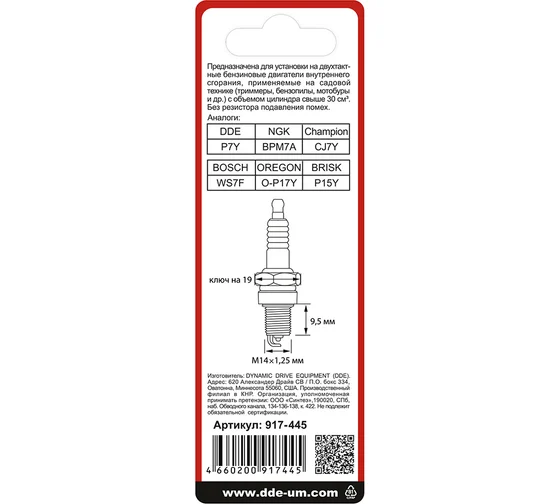 Свеча зажигания P7Y DDE аналог Champion CJ7Y, Bosch WS8F, NGK BPM7A, используется на двухтактных двигателях без резистора с объёмом цилиндра свыше 30 куб/см.