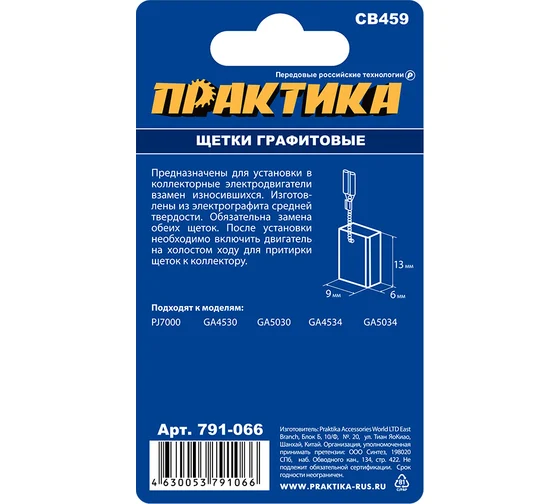 Щетка графитовая для MAKITA (аналог CB-459/арт.194722-3) 6x9x13 мм ПРАКТИКА 791-066