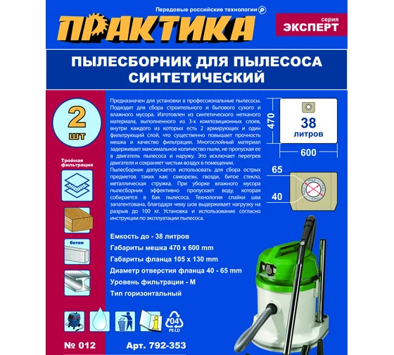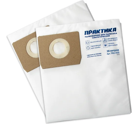 Мешки ПРАКТИКА 38 л, синтетич., 2 шт для пылесосов SOTECO, KARCHER, HITACHI и др. 792-353