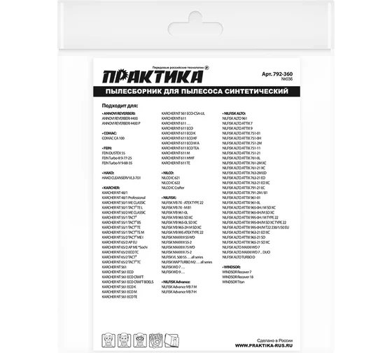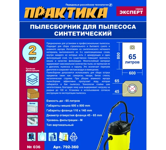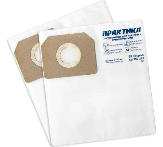 Мешки ПРАКТИКА 65 л, синтетич., 2 шт для пылесосов KARCHER, NILFISK, FEIN и др. 792-360
