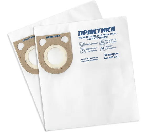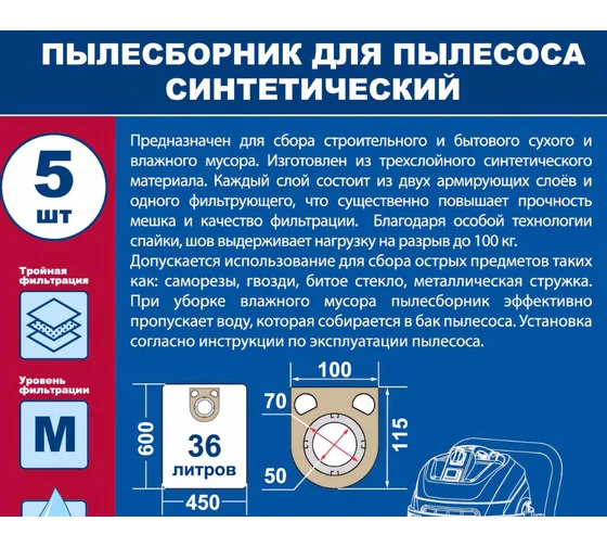 Предназначены для сбора строительного и бытового сухого и влажного мусора. Изготовлены из трехслойного синтетического материала. Каждый слой состоит из двух армирующих слоёв и одного фильтрующего, что существенно повышает прочность мешка и качество фильтрации. Благодаря особой технологии спайки, шов выдерживает нагрузку на разрыв до 100 кг. Допускается использование для сбора острых предметов таких как: саморезы, гвозди, битое стекло, металлическая стружка. При уборке влажного мусора пылесборник эффективно пропускает воду, которая собирается в бак пылесоса. Установка согласно инструкции по эксплуатации пылесоса.