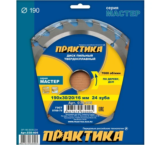 Диск пильный по дереву (190х30/20/16 мм; Z24) ПРАКТИКА 030-405