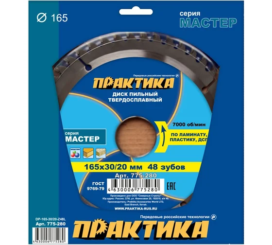 Диск пильный по ламинату (165х30/20 мм; Z48) ПРАКТИКА 775-280
