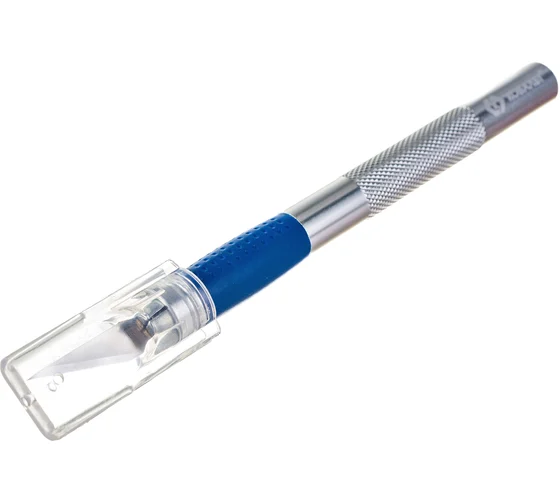Нож для художественных работ используется для вырезания заготовок из шпона, пластика, резины, а также точного и аккуратного реза ткани, кожи, картона, бумаги для различного декора. Металлическая рукоять инструмента имеет обрезиненное покрытие для удобного и надежного захвата без проскальзывания руки.