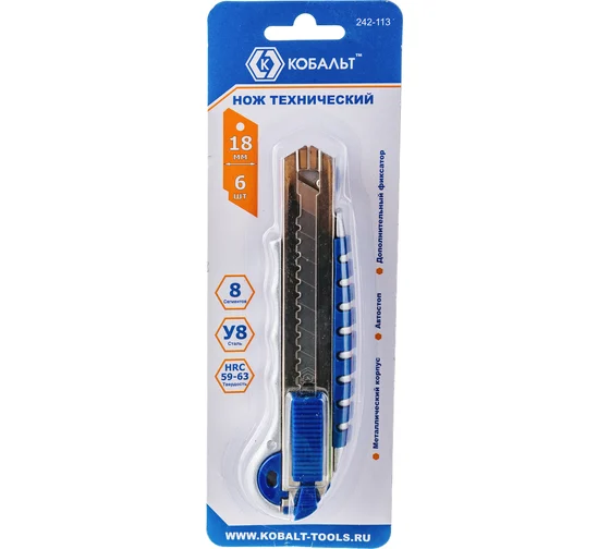Нож технический КОБАЛЬТ лезвия 18 мм (6 шт.), металлический корпус, автостоп, доп. фиксатор 242-113