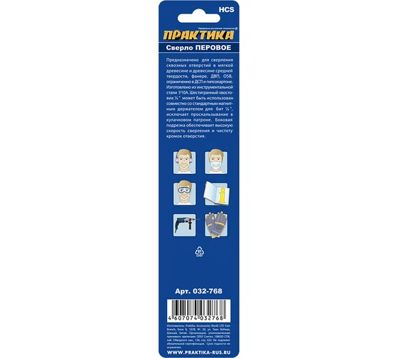 Перовые сверла изготовлены из высококачественной углеродистой инструментальной стали У10А. Шестигранный хвостовик 1/4'' может использоваться со стандартными магнитными держателями для бит, это позволяет быстро менять инструмент. Хорошо фиксируется в кулачковом патроне без проскальзывания. Сверла имеют боковую подрезку для чистого сверления неглубоких и сквозных отверстий в мягкой и средней твердости древесине. Высокая скорость сверления. Допустима перезаточка.