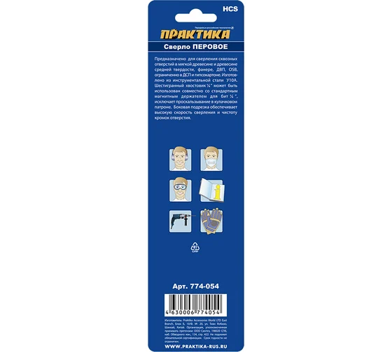 Перовые сверла изготовлены из высококачественной углеродистой инструментальной стали У10А. Шестигранный хвостовик 1/4'' может использоваться со стандартными магнитными держателями для бит, это позволяет быстро менять инструмент. Хорошо фиксируется в кулачковом патроне без проскальзывания. Сверла имеют боковую подрезку для чистого сверления неглубоких и сквозных отверстий в мягкой и средней твердости древесине. Высокая скорость сверления. Допустима перезаточка.