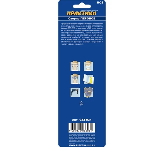 Перовые сверла изготовлены из высококачественной углеродистой инструментальной стали У10А. Шестигранный хвостовик 1/4'' может использоваться со стандартными магнитными держателями для бит, это позволяет быстро менять инструмент. Хорошо фиксируется в кулачковом патроне без проскальзывания. Сверла имеют боковую подрезку для чистого сверления неглубоких и сквозных отверстий в мягкой и средней твердости древесине. Высокая скорость сверления. Допустима перезаточка.