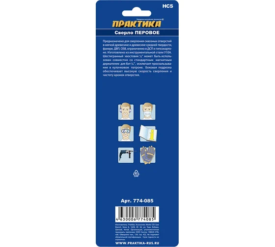 Перовые сверла изготовлены из высококачественной углеродистой инструментальной стали У10А. Шестигранный хвостовик 1/4'' может использоваться со стандартными магнитными держателями для бит, это позволяет быстро менять инструмент. Хорошо фиксируется в кулачковом патроне без проскальзывания. Сверла имеют боковую подрезку для чистого сверления неглубоких и сквозных отверстий в мягкой и средней твердости древесине. Высокая скорость сверления. Допустима перезаточка.