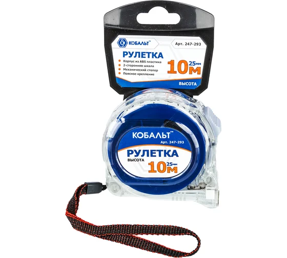 Рулетка КОБАЛЬТ Высота 10м x 25мм прозрачный корпус (мех.стопор, 2-сторонняя шкала, белое матов. покрытие, толщ. 0,11 мм) 247-293