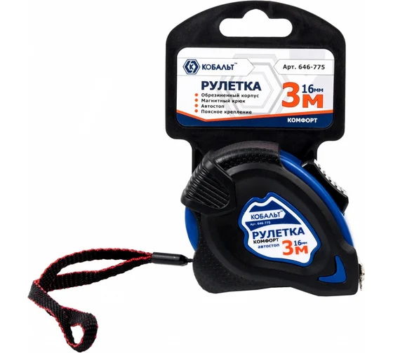 Рулетка КОБАЛЬТ Комфорт 3м x 16мм обрезиненный корпус (автостоп, магн. крючок, матов. покрытие, толщ. 0,13 мм) 646-775