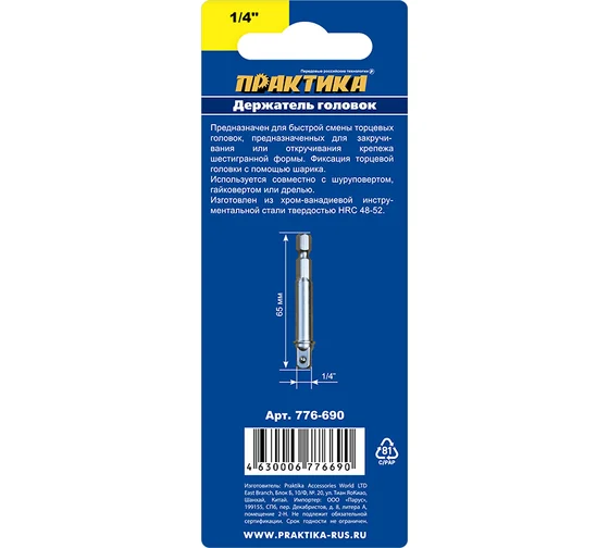 Адаптер квадрат 1/4 для головок, длина 65 мм ПРАКТИКА 776-690