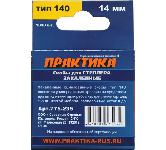 Скобы для степлера (1000 шт; 14х1.2х10.6 мм) ПРАКТИКА 775-235