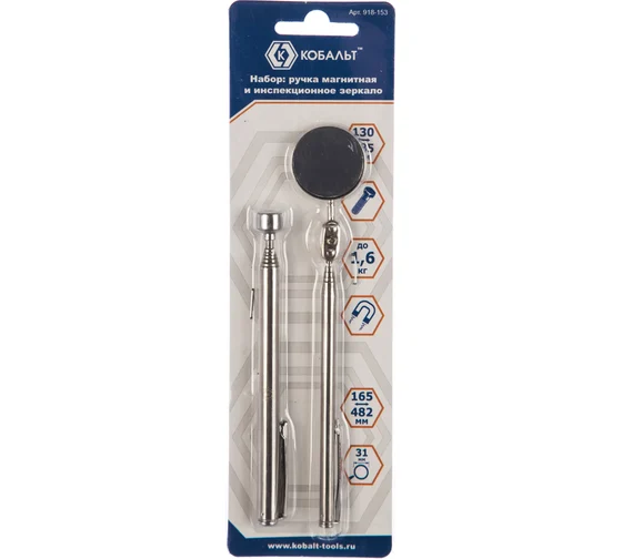 Ручка магнитная телескопическая КОБАЛЬТ 130 - 635 мм, магнит до 1.6 кг в наборе с зеркалом телескопическим инспекционным 165 - 482мм, 31 мм 918-153