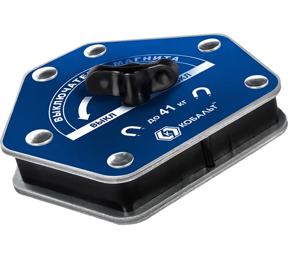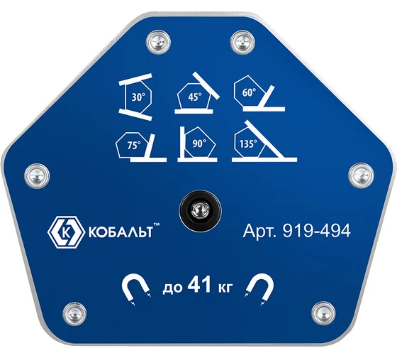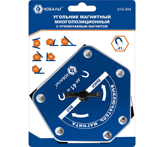 Угольник магнитный КОБАЛЬТ 123 * 103 мм, ОТКЛЮЧАЕМЫЙ МАГНИТ, на 6 углов: 30, 45, 60, 75, 90, 135 град., магнит до 41 кг, блистер 919-494