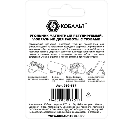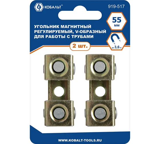 Угольник магнитный КОБАЛЬТ 55 мм, V-ОБРАЗНЫЙ, регулируемый, для работы с трубами, магнит до 3,6 кг., 2 шт., блистер 919-517