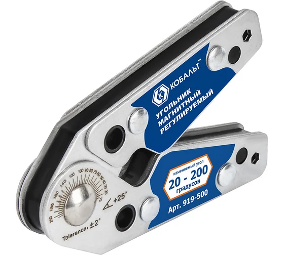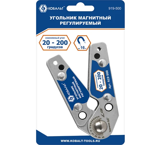 Угольник магнитный КОБАЛЬТ 101*63 мм, РЕГУЛИРУЕМЫЙ, диапазон углов 20-200 град., тран-р, ключ д/фиксации, магнит до 16 кг, блистер 919-500