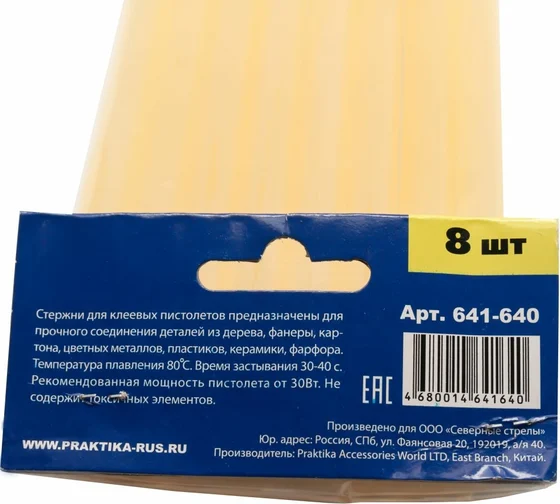 Клей желтый, прозрачный (8 шт; 11х200 мм) для клеевого пистолета ПРАКТИКА 641-640