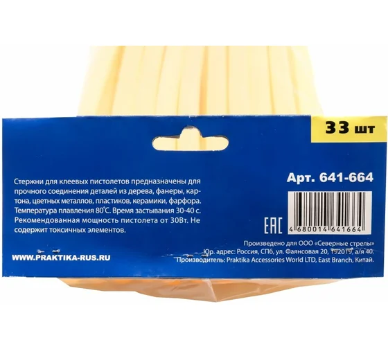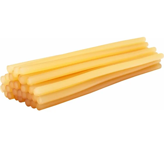 Клей жёлтый, прозрачный (33 шт; 11х300 мм) для клеевого пистолета предназначен для прочного соединения деталей из дерева, фанеры, картона, цветных металлов, пластиков, керамики, фарфора. Температура плавления 80°С. Время застывания 30-40 с. Рекомендованная мощность пистолета от 30 Вт. Не содержит токсичных элементов.