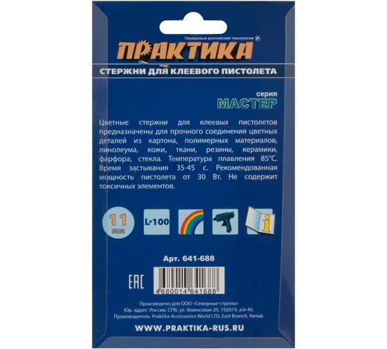 Клей для клеевого пистолета цветной (6 шт; 11х100 мм; 3 цвета) ПРАКТИКА 641-688
