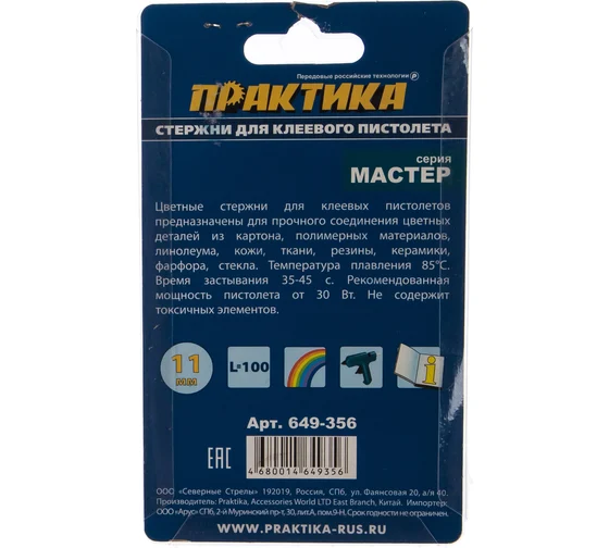 Клей для клеевого пистолета цветной (6 шт; 11х100 мм; 3 цвета) ПРАКТИКА 649-356