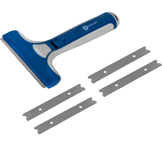 Применяется для очистки гладких поверхностей от различных загрязнений. Имеет механизм быстрой смены лезвия. В комплекте 5 запасных лезвий. Длина рукоятки 150 мм.
