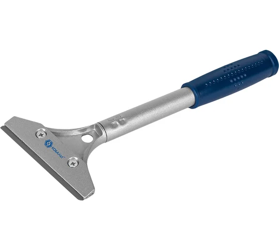 Применяется для очистки гладких поверхностей от различных загрязнений. Имеет механизм быстрой смены лезвия. В комплекте 5 запасных лезвий. Длина рукоятки 150 мм.