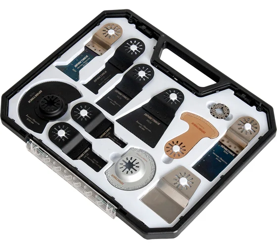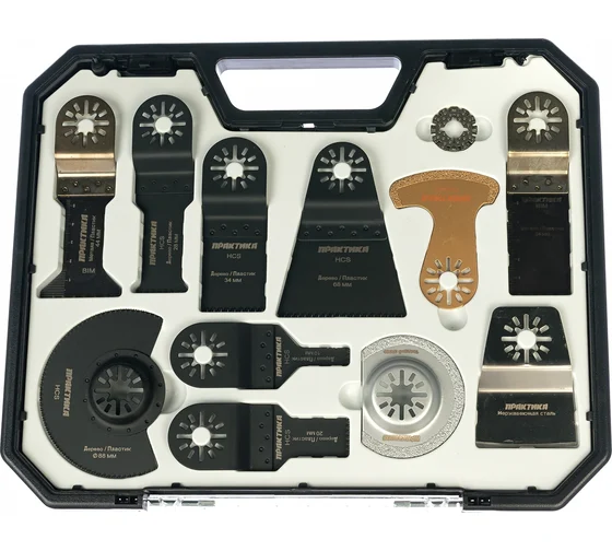 Набор насадок используется совместно с многофункциональным инструментом. Применяется при обработке дерева, ДСП, фанеры, пластика, листов ГКЛ, стали, цветных металлов, плитки, камня. Набор включает двенадцать насадок, позволяющих производить различные виды работ: выборка пазов, подрезание внутренних углов, вырезание проемов, резка плинтусов, пластиковых труб и т. д.
