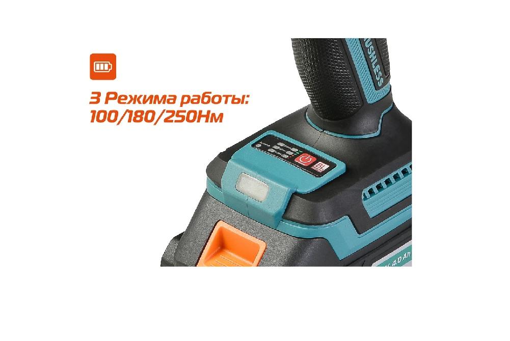 Кроме того, бесщеточный двигатель отлично справляется с кратковременными перегрузками и не склонен к перегреву. Благодаря применению мощного планетарного механизма винтоверт уверенно демонстрирует высокие показатели крутящего момента (до 250 Нм), что позволяет работать с крепежом большой длины и диаметра. Винтоверт имеет три режима настройки момента затяжки: 100 Нм, 180 Нм, 250 Нм.